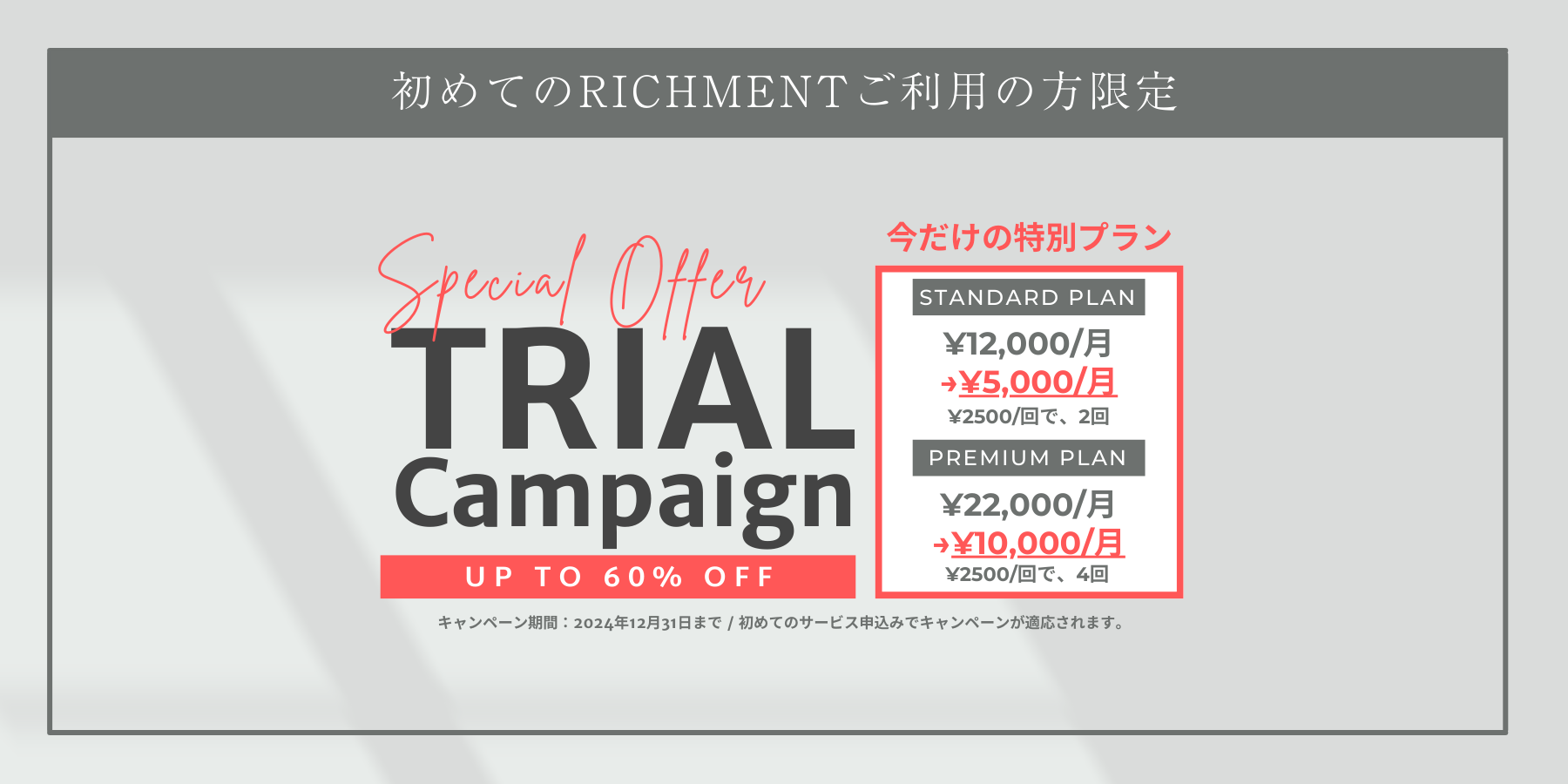 リッチメントの魅力を体験していただくために、初回限定でトライアルキャンペーン実施中を特別価格をご用意しました!