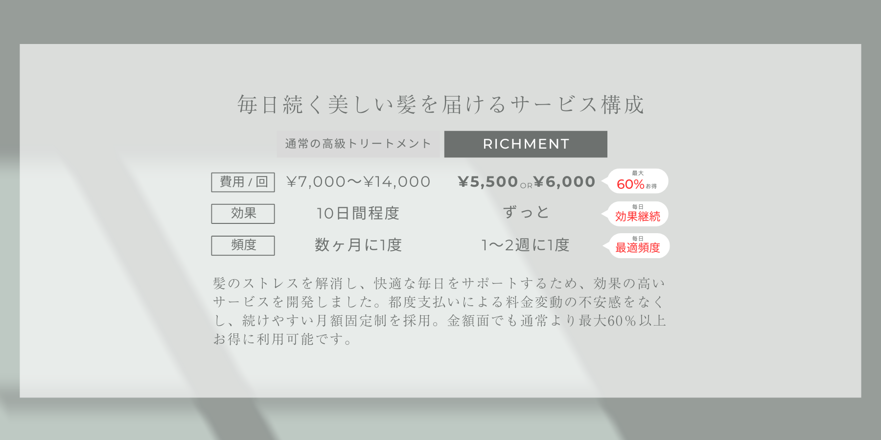 通常のサロントリートメントと比べて、最大で60%以上もお得にサービスを利用できる特別な『プレミアムトリートメントサブスクリプションサービス』となっています。